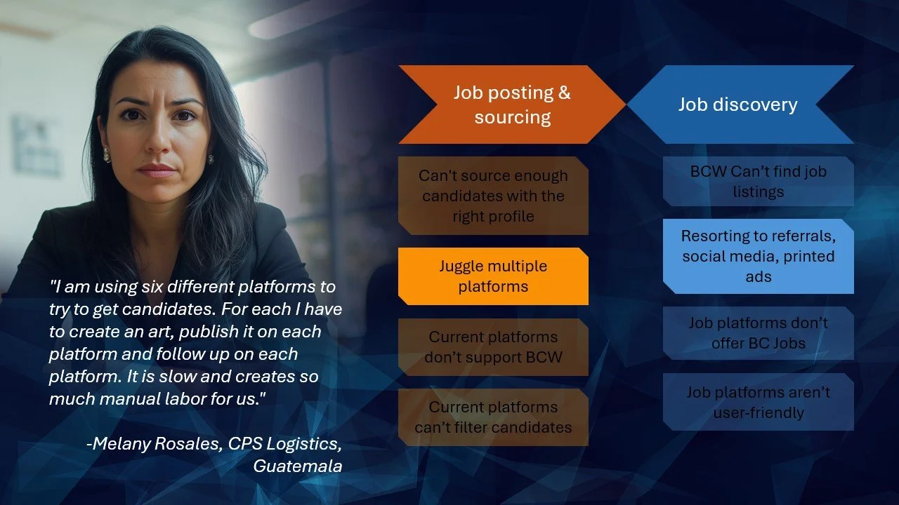 Recruitment across Latin America in blue-collar industries is fragmented and inefficient. HR managers face scattered platforms, poor filters, and manual processes that lead to wasted time and hiring success rates as low as 2–5%. On the other side, job seekers struggle with opaque applications, costly document requirements, and little-to-no feedback—turning the process into what many described as a “black hole.” These pain points result in mismatched talent, high turnover, and significant financial losses for businesses.